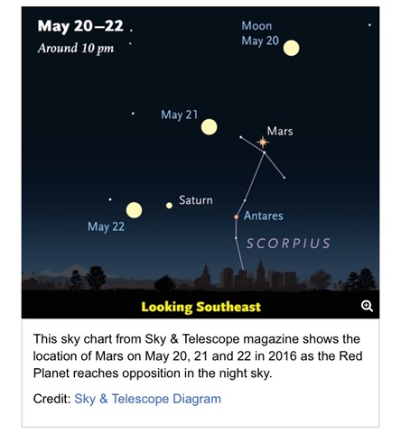 As you know if you’ve been around SST for a while, I’m a total NASA nerd. This year, Earth is much closer to Mars than we’ve been in a long time, When Ray found out that May is the best time to see Mars, we’ve been checking out the gorgeous sight in the sky all week – no binoculars or telescope necessary! The peak time to see Mars “up close” is May 30, but it can already be seen. Definitely worth stepping outside to take a look (it’s moving quickly, so check for an updated map on google when you have the opportunity to take a peek.)