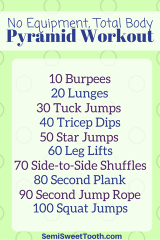 This total body pyramid workout includes no weights at all. The entire workout can be done anywhere using your body weight alone. Remember to keep good form and push yourself throughout the entire pyramid. You’ve got this!