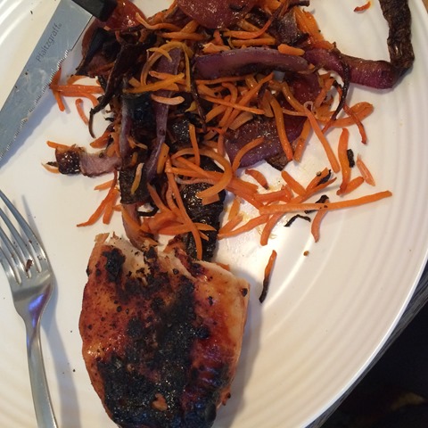 It looks digusting, but trust me, it was good. 1/2 a breast of chicken, and baked shredded carrots, red onion, and a couple pepperoni slices. Still emptying out our fridge and it worked out perfectly!