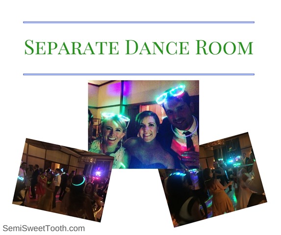 There was a space just adjacent to our dinner room that is typically used as a “pre-function” space – i.e. where you pick up your escort cards, there’s a bathroom in there, and they usually set up some couches or seating in the space. But we figured, why not use that as our dance room!